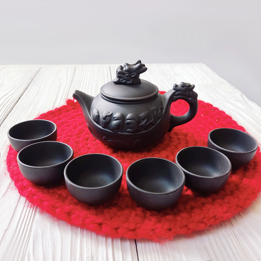 Чайний набір виготовлений із глини, має шорстку приємну текстуру. Весь набір вміщує проведення чаювання для кола осіб до 6 персон.